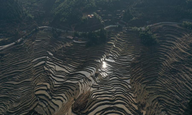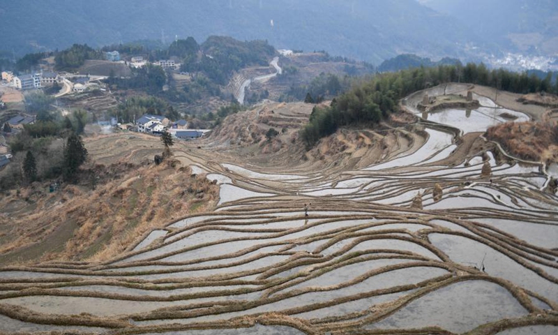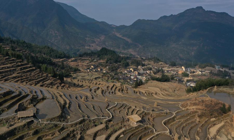 Photo taken on Feb. 3, 2021 shows the scenery of terraced fields in Chongtou Township of Yunhe County, east China's Zhejiang Province. (Xinhua/Huang Zongzhi)