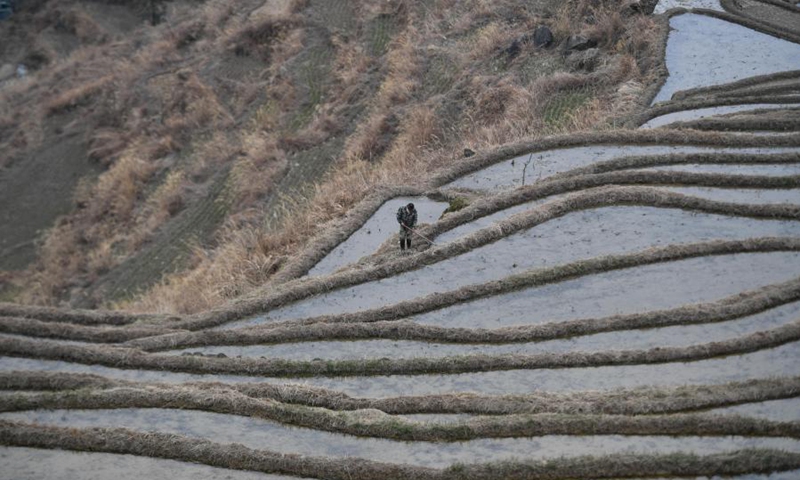 A farmer works in terraced fields in Chongtou Township of Yunhe County, east China's Zhejiang Province, Feb. 3, 2021. (Xinhua/Huang Zongzhi)