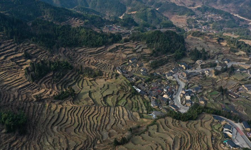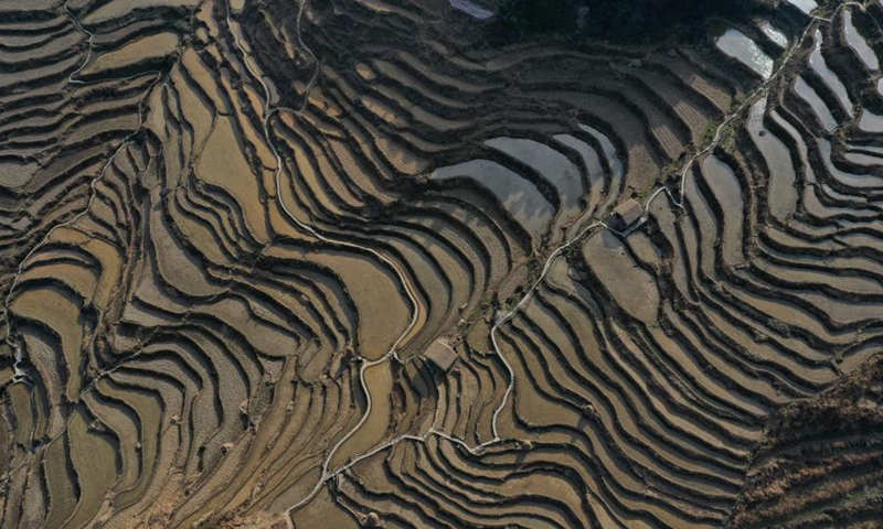 Aerial photo taken on Feb. 3, 2021 shows the scenery of terraced fields in Chongtou Township of Yunhe County, east China's Zhejiang Province. (Xinhua/Huang Zongzhi)
