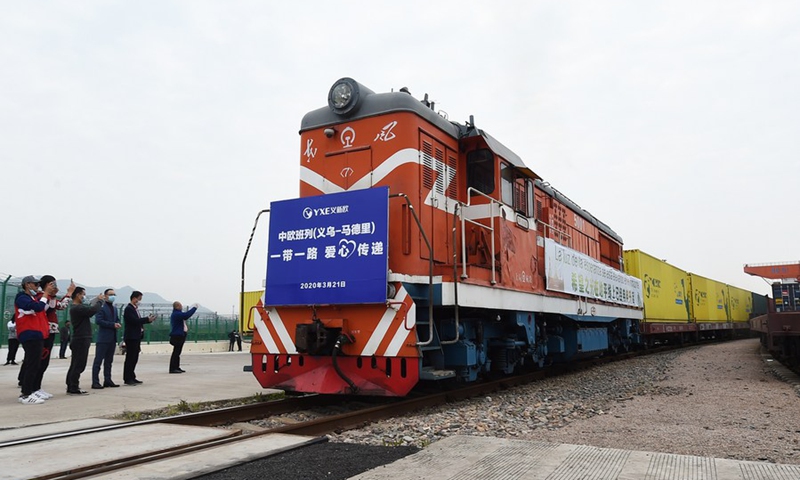 A China-Europe freight train carrying two containers of medical supplies among other goods leaves for Madrid, Spain from Yiwu China on March 21, 2020. (Photo by Gong Xianming/Xinhua)