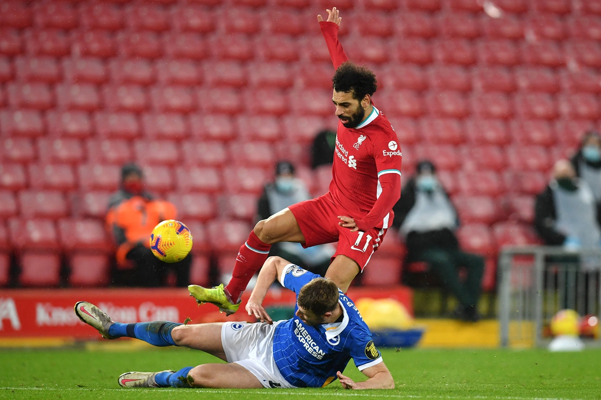 Mohamed Salah (above) of Liverpool is tackled by Adam Webster of Brighton and Hove Albion in their Premier League match on Wednesday in Liverpool. Photo: VCG