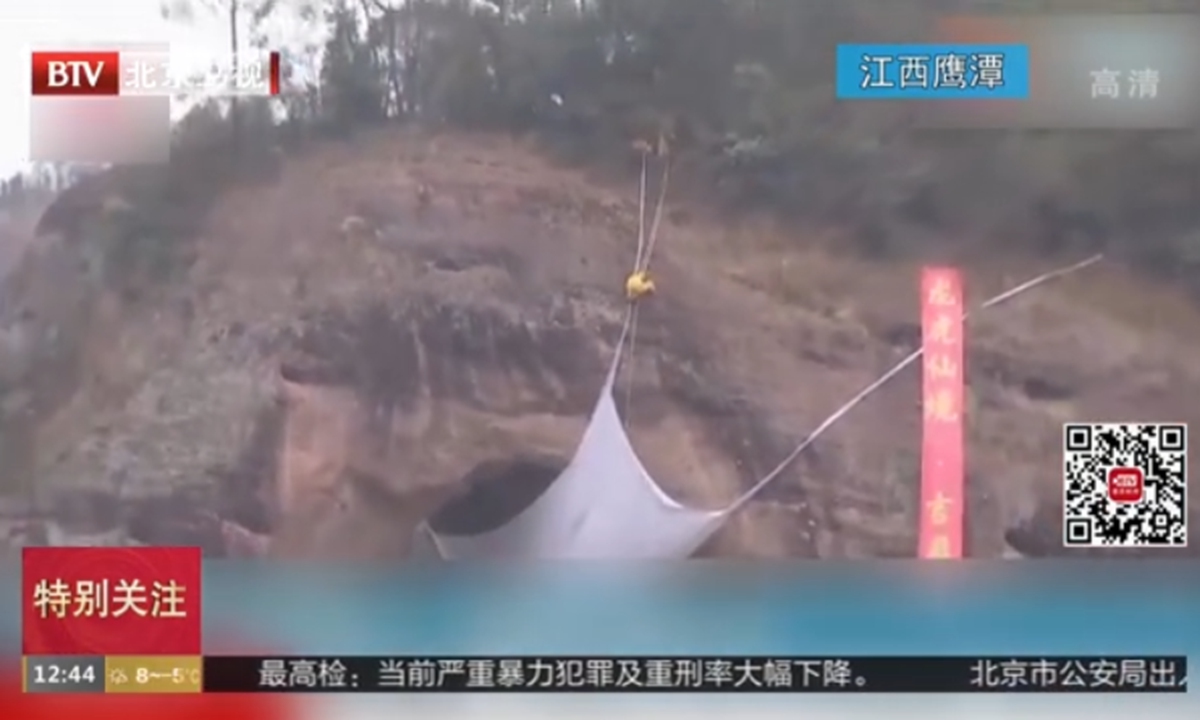 Eight farmers climbed the cliff of the peak and hung the huge white cloth on the base of the "trunk" using long ropes.