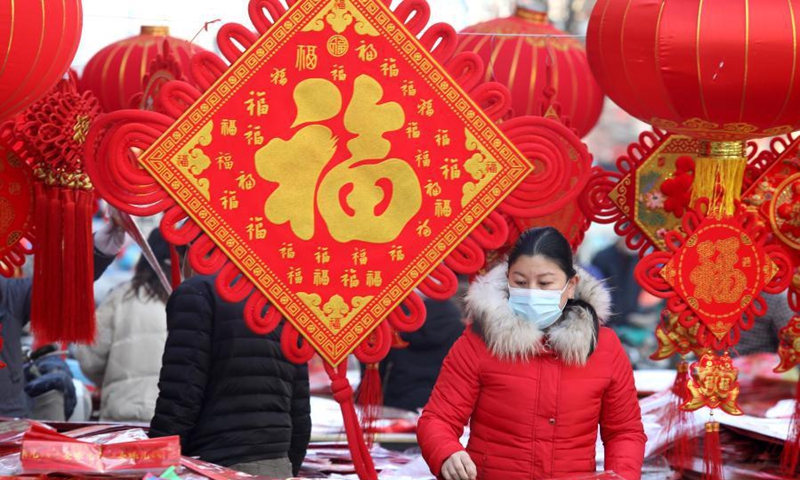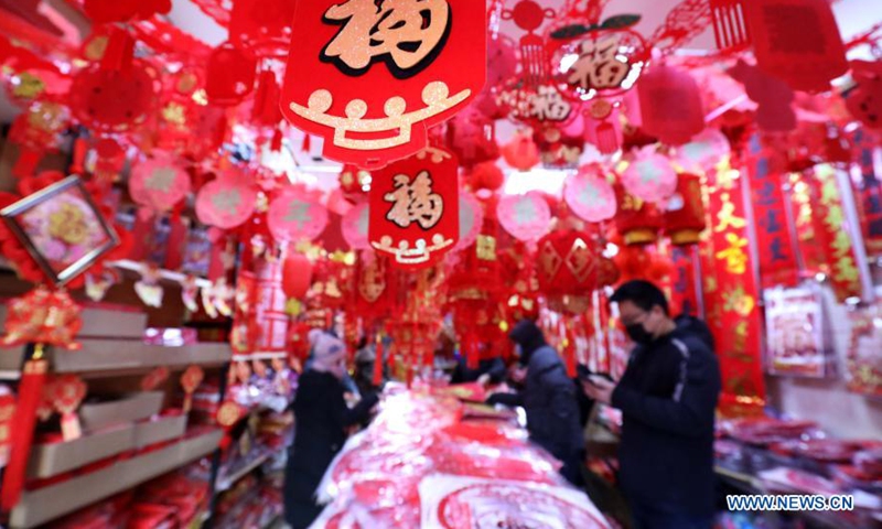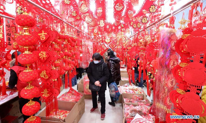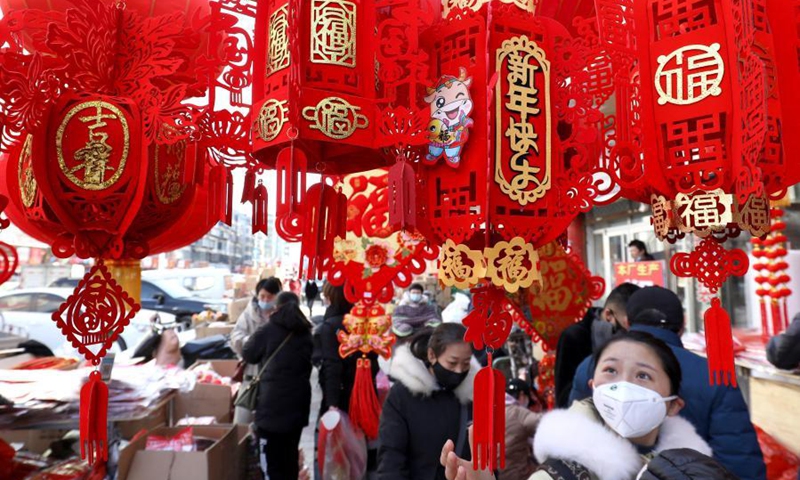 People shop for the upcoming Spring Festival at a market in Shijiazhuang, north China's Hebei Province, Feb. 3, 2021. Life gradually returns to normal in Shijiazhuang, capital of north China's Hebei Province. (Photo by Liang Zidong/Xinhua)
