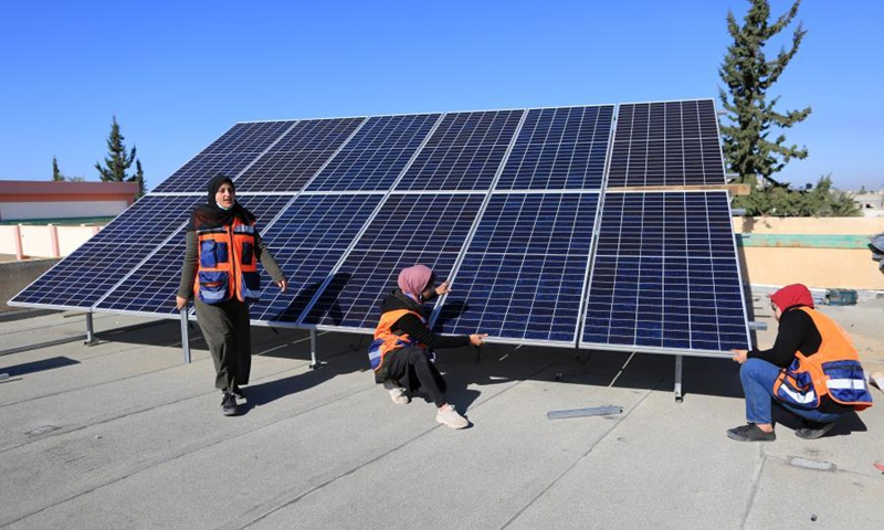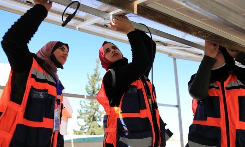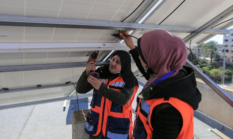 Palestinian young women work on installing solar panels on a school rooftop at al-Qarara town, north of the southern Gaza Strip city of Khan Younis, Feb. 1, 2021. Ramah Al-Buhaisi, Hanin Musa and Marah Kharma, three young women have earned their diploma certificates in Solar Power Installation from the United Nations Relief and Works Agency (UNRWA) Education programme in Gaza City. (Photo by Yasser Qudih/Xinhua)