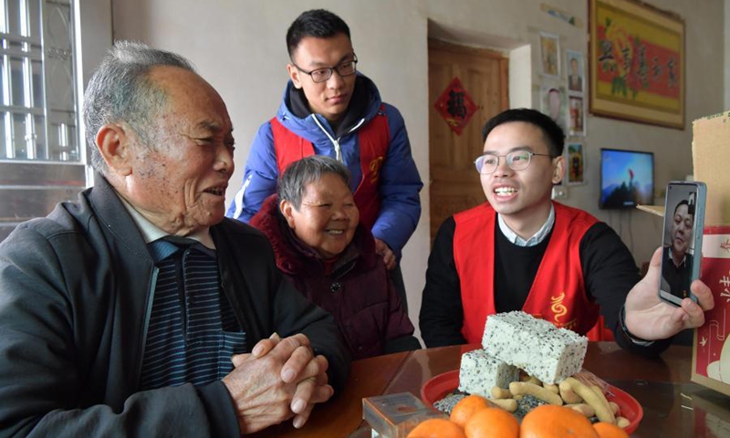 Community workers visit villagers and help them chat with their son who works in south China's Guangxi Zhuang Autonomous Region via video link in Quantang Village of Shuibei Township in Xinyu City, east China's Jiangxi Province, Feb. 3, 2021.(Xinhua/Peng Zhaozhi)