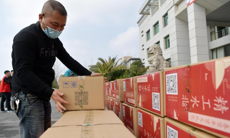 A staff member of local government prepare local specialties in Shuibei Township of Xinyu City, east China's Jiangxi Province, Feb. 3, 2021, before delivering them as Chinese New Year gift for migrant workers in other places.(Xinhua/Peng Zhaozhi)