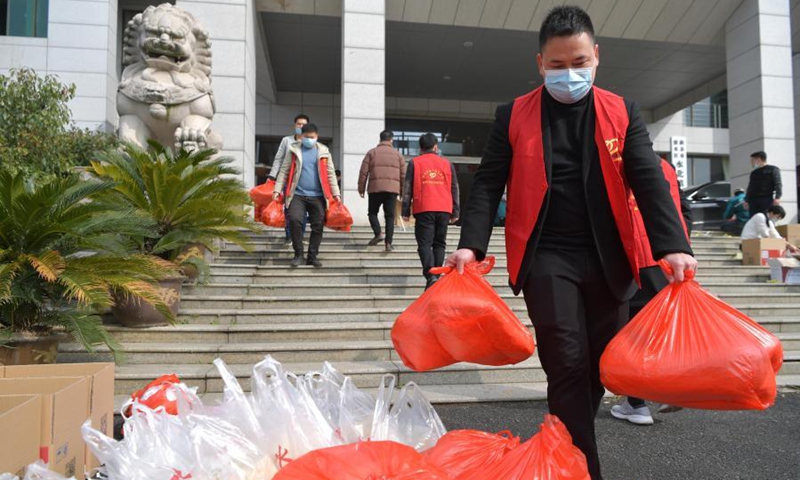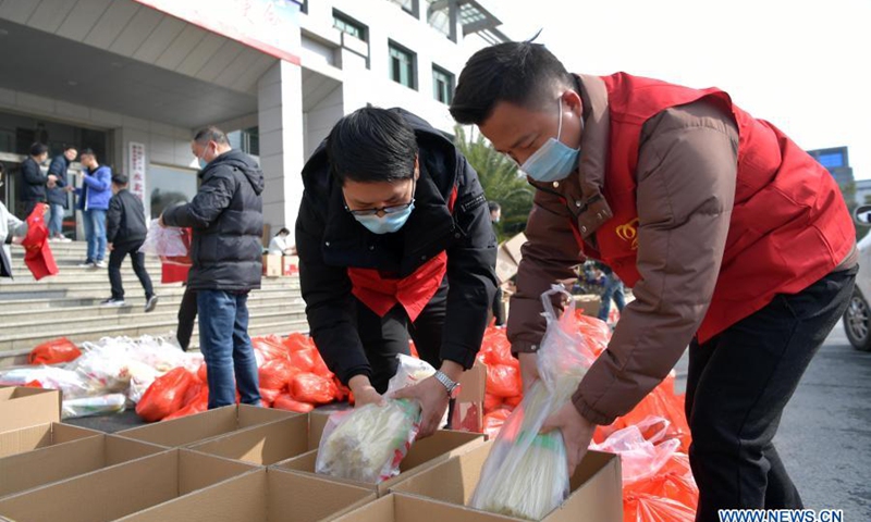 Staff members of local government prepare local specialties in Shuibei Township of Xinyu City, east China's Jiangxi Province, Feb. 3, 2021, before delivering them as Chinese New Year gift for migrant workers in other places.(Xinhua/Peng Zhaozhi)