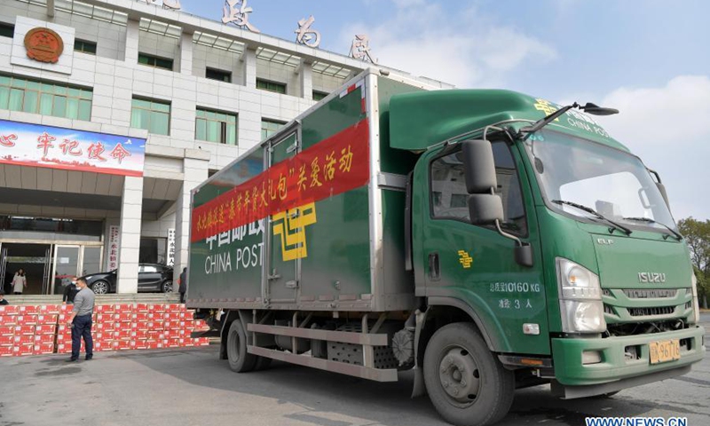 A truck loaded with local specialties as Chinese New Year gift kits, which will be sent to migrant workers in other places, prepares to leave Shuibei Township of Xinyu City, east China's Jiangxi Province, Feb. 3, 2021.(Xinhua/Peng Zhaozhi)