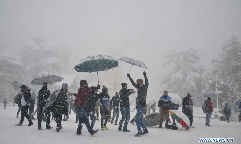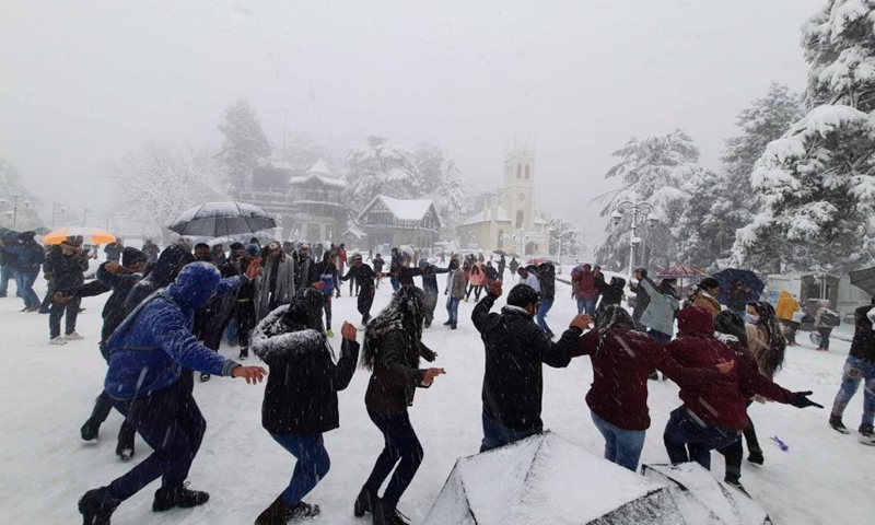 Tourists dance in heavy snowfall at a popular tourist site in Shimla of India's northern state of Himachal Pradesh, Feb. 4, 2021. Photo:Xinhua