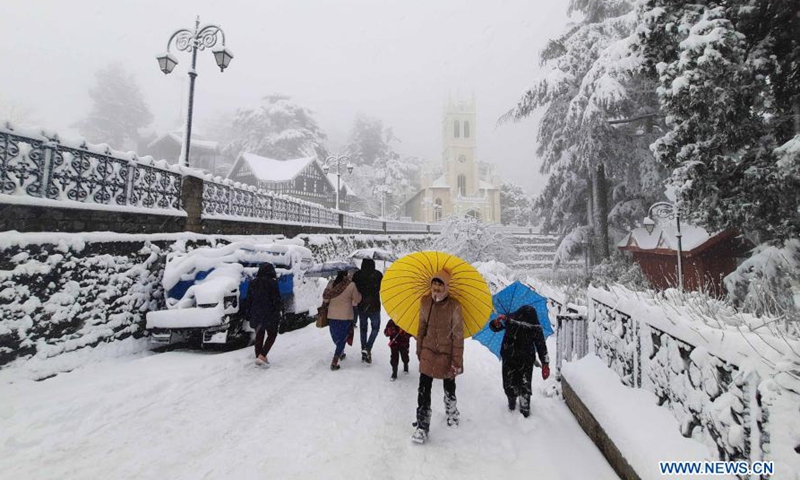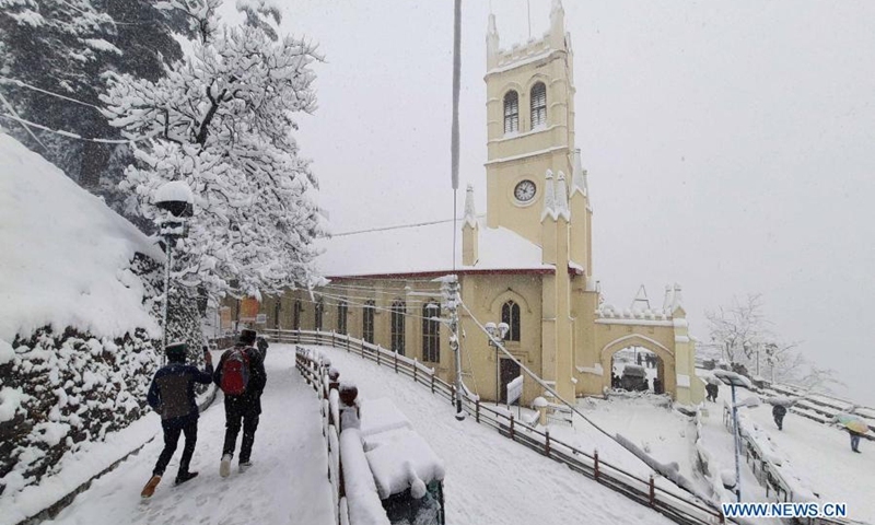 People walk on a snow-covered road during heavy snowfall at a popular tourist site in Shimla of India's northern state of Himachal Pradesh, Feb. 4, 2021. Photo:Xinhua