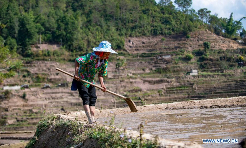 A farmer works in Hani terraced fields in Sancun Township of Honghe County, southwest China's Yunnan Province., Feb. 4, 2021. (Xinhua/Chen Xinbo)