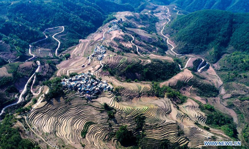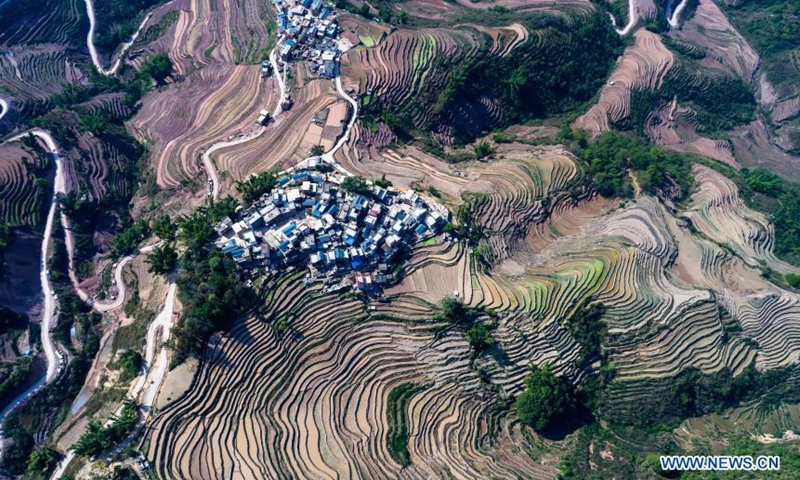Aerial photo taken Feb. 4, 2021 shows a village surrounded by Hani terraced fields in Sancun Township of Honghe County, southwest China's Yunnan Province. (Xinhua/Chen Xinbo)