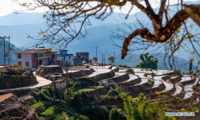 Photo taken Feb. 4, 2021 shows houses and Hani terraced fields in Sancun Township of Honghe County, southwest China's Yunnan Province. (Xinhua/Chen Xinbo)