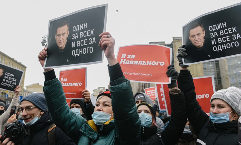 Protesters hold posters in support of detained Russian opposition leader Alexei Navalny during an unsanctioned rally at Pushkin Square in central Moscow on Jan. 23, 2021.Photo:Xinhua