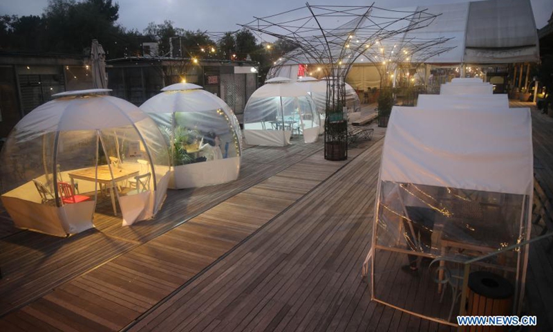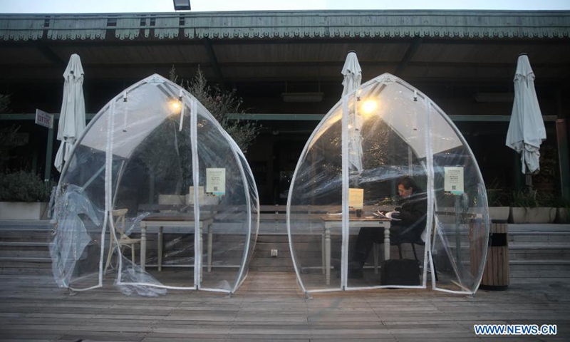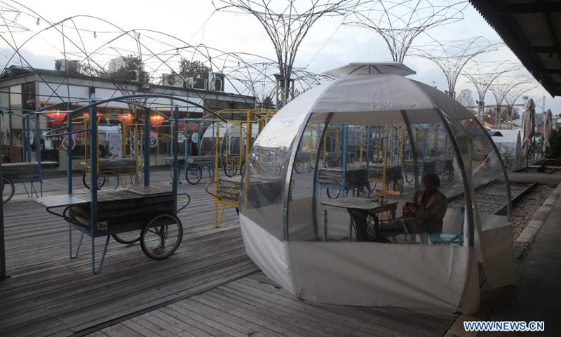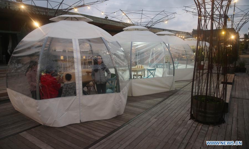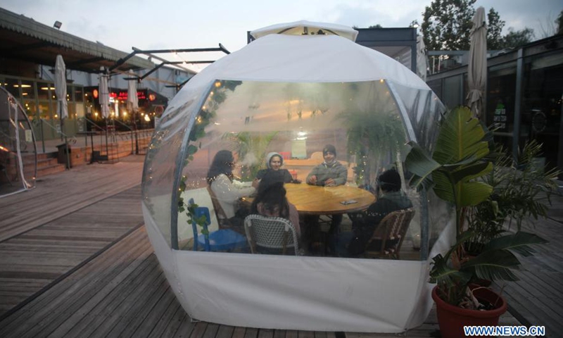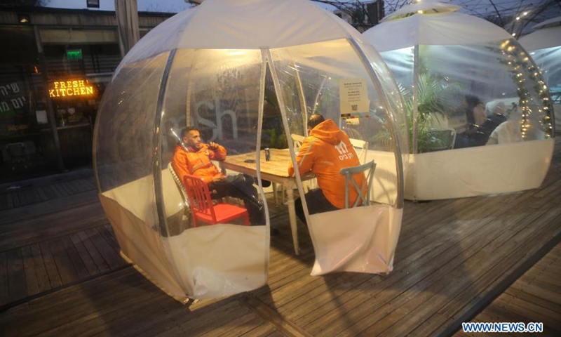 People sit in an outdoor dining bubble amid the COVID-19 pandemic in Jerusalem, on Feb. 5, 2021.Photo:Xinhua