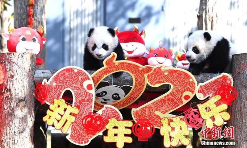 Giant panda cubs born in 2020 play at Shenshuping base of China Conservation and Research Center for Giant Pandas in Wolong National Nature Reserve, southwest China's Sichuan Province, Feb. 3, 2021.Photo:Xinhua
