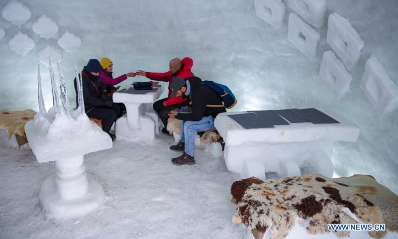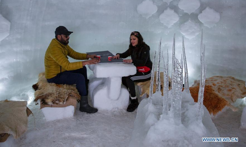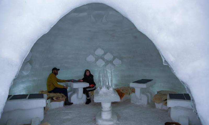 Tourists have tea inside an igloo cafe in Gulmarg, about 48km north of Srinagar city, the summer capital of Indian-controlled Kashmir, Feb. 5, 2021. The igloo cafe has become a tourist attraction at a ski resort in Gulmarg. (Xinhua/Javed Dar)