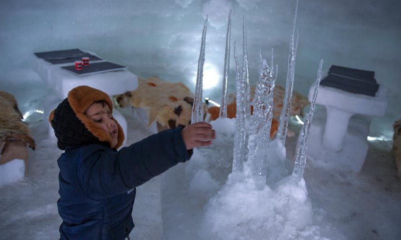 A child plays with icicles inside an igloo cafe in Gulmarg, about 48km north of Srinagar city, the summer capital of Indian-controlled Kashmir, Feb. 5, 2021. The igloo cafe has become a tourist attraction at a ski resort in Gulmarg. (Xinhua/Javed Dar)