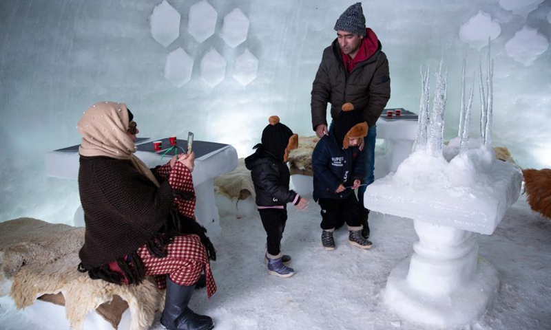 A tourist takes photo of her family inside an igloo cafe in Gulmarg, about 48km north of Srinagar city, the summer capital of Indian-controlled Kashmir, Feb. 5, 2021. The igloo cafe has become a tourist attraction at a ski resort in Gulmarg. (Xinhua/Javed Dar)