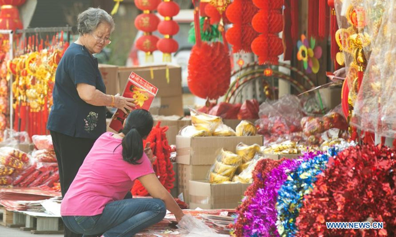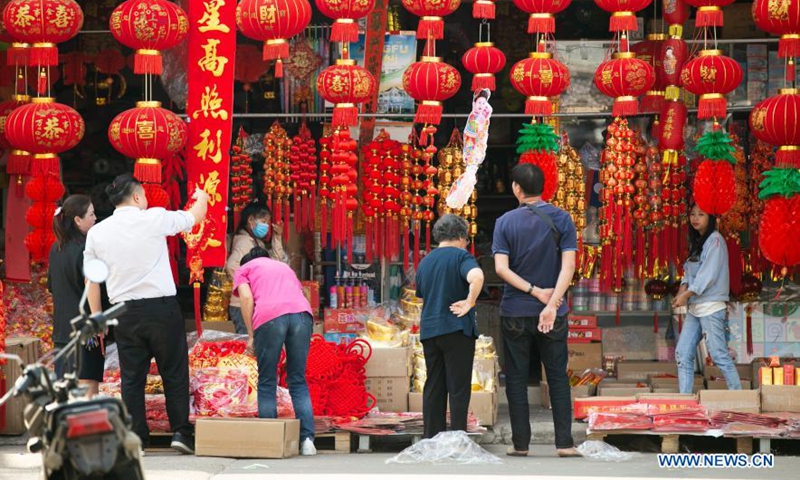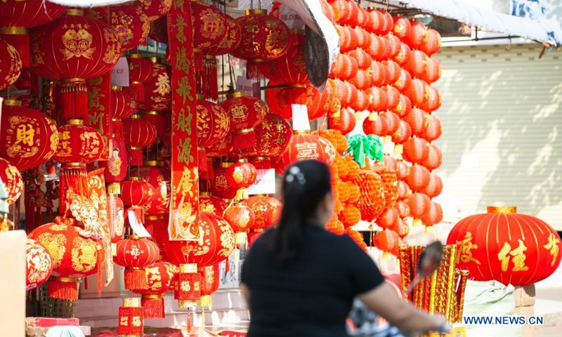 Decorations for the upcoming Spring Festival are seen at a market in Vientiane, Laos, on Feb. 4, 2021. Spring Festival, or Chinese Lunar New Year, falls on Feb. 12 this year. (Photo by Kaikeo Saiyasane/Xinhua)