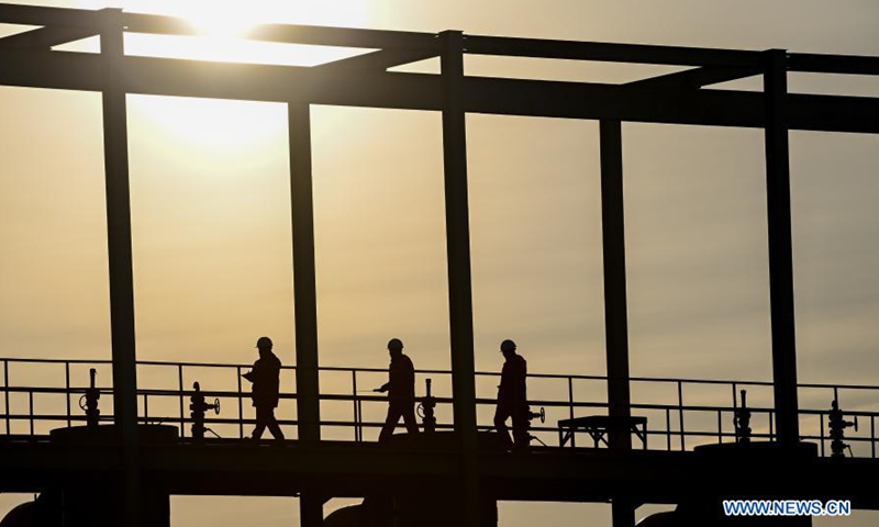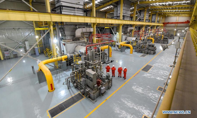 Maintenance workers are on patrol inspection at the Horgos initial compressor station of the West Pipeline Company under China Oil & Gas Pipeline Network Corporation (PipeChina) in Horgos, northwest China's Xinjiang Uygur Autonomous Region, Feb. 4, 2021. (Xinhua/Ding Lei)
