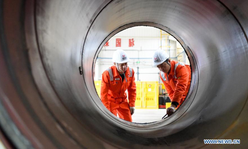 Maintenance workers exchange ideas on natural gas pipe welding techniques at the Horgos initial compressor station of the West Pipeline Company under China Oil & Gas Pipeline Network Corporation (PipeChina) in Horgos, northwest China's Xinjiang Uygur Autonomous Region, Feb. 4, 2021. (Xinhua/Ding Lei)