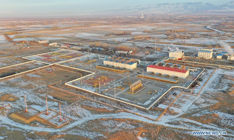 Aerial photo taken on Feb. 4, 2021 shows a general view of the Horgos initial compressor station of the West Pipeline Company under China Oil & Gas Pipeline Network Corporation (PipeChina) in Horgos, northwest China's Xinjiang Uygur Autonomous Region. (Xinhua/Ding Lei)