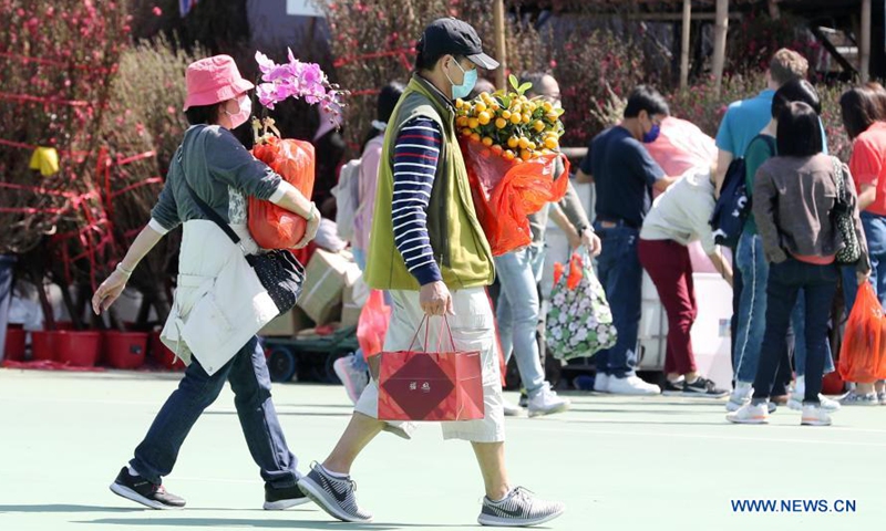 Customers visit a Lunar New Year flower market at Victoria Park in Hong Kong, south China, Feb. 6, 2021. Hong Kong has scaled down its Lunar New Year flower trade amid the COVID-19 pandemic, only opening 15 designated flower markets for customers under epidemic prevention regulations. (Xinhua/Li Gang)