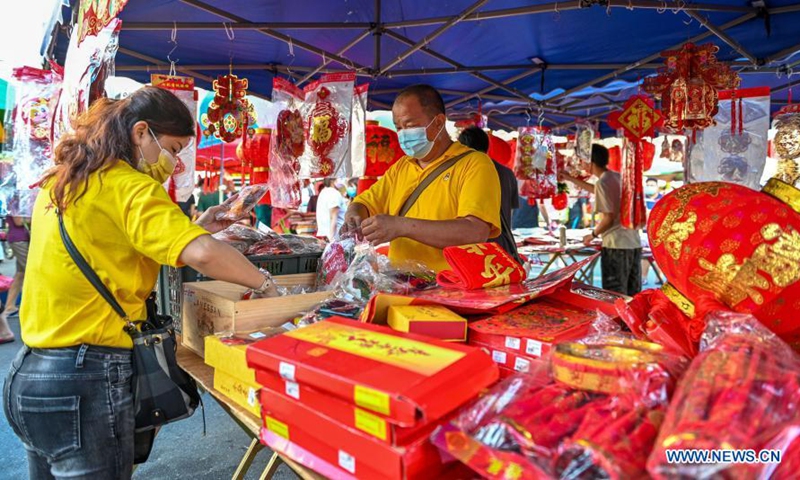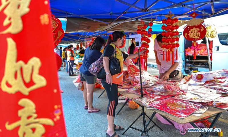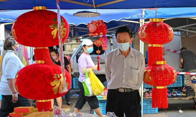 People wearing face masks shop for Chinese New Year decorations at a market in Klang of Selangor state, Malaysia, Feb. 6, 2021. (Photo by Chong Voon Chung/Xinhua)