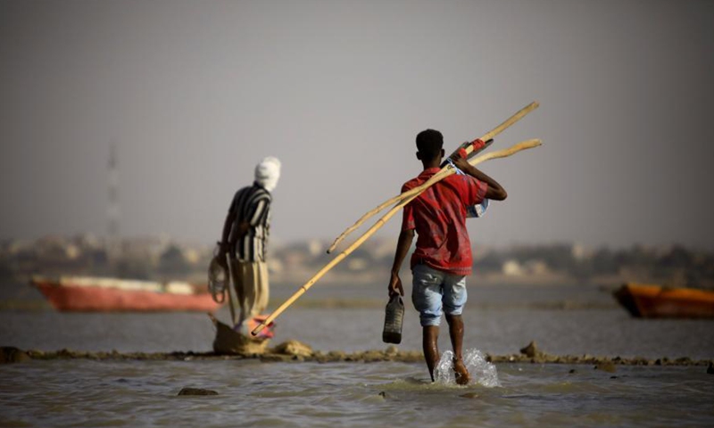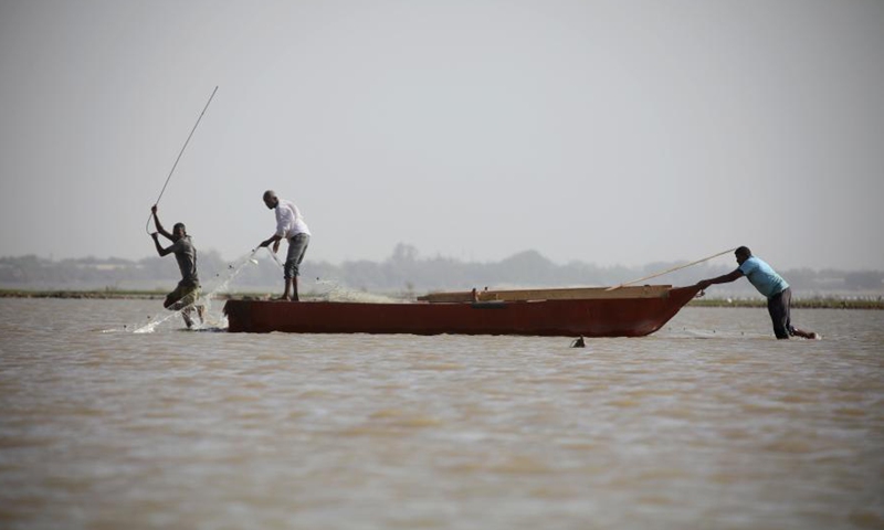 Photo taken on Feb. 6, 2021 shows fishermen fishing on the bank of the White Nile in Khartoum, Sudan. (Photo by Mohamed Khidir/Xinhua)