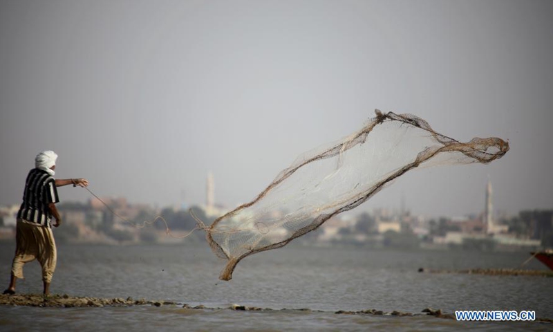 Photo taken on Feb. 6, 2021 shows a fisherman fishing on the bank of the White Nile in Khartoum, Sudan. (Photo by Mohamed Khidir/Xinhua)