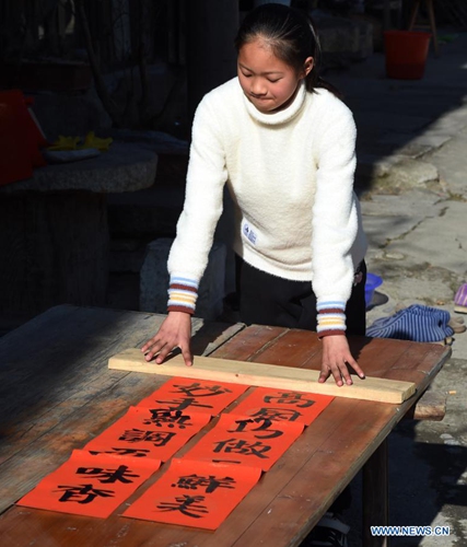 A villager airs Spring Festival couplets in Zhaji Village of Jingxian County, east China's Anhui Province, Feb. 6, 2021. As the Spring Festival approaches, villagers are busy preparing goods in Zhaji Village, a village with over 1,000 years of history. (Xinhua/Zhou Mu)