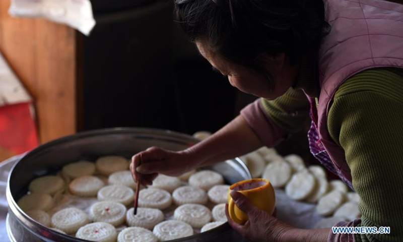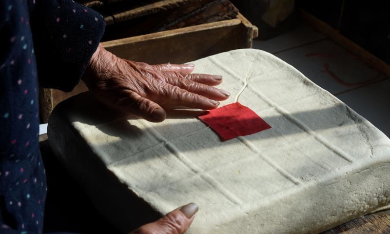 A villager lays a piece of red paper on newly cooked Chinese Tofu in Zhaji Village of Jingxian County, east China's Anhui Province, Feb. 6, 2021. As the Spring Festival approaches, villagers are busy preparing goods in Zhaji Village, a village with over 1,000 years of history. (Xinhua/Zhou Mu)