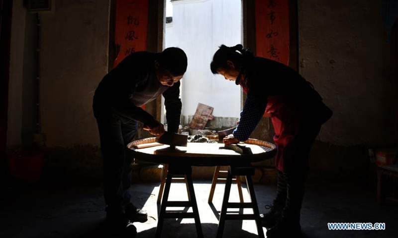 Villagers make sesame seed candy in Zhaji Village of Jingxian County, east China's Anhui Province, Feb. 6, 2021. As the Spring Festival approaches, villagers are busy preparing goods in Zhaji Village, a village with over 1,000 years of history. (Xinhua/Zhou Mu)