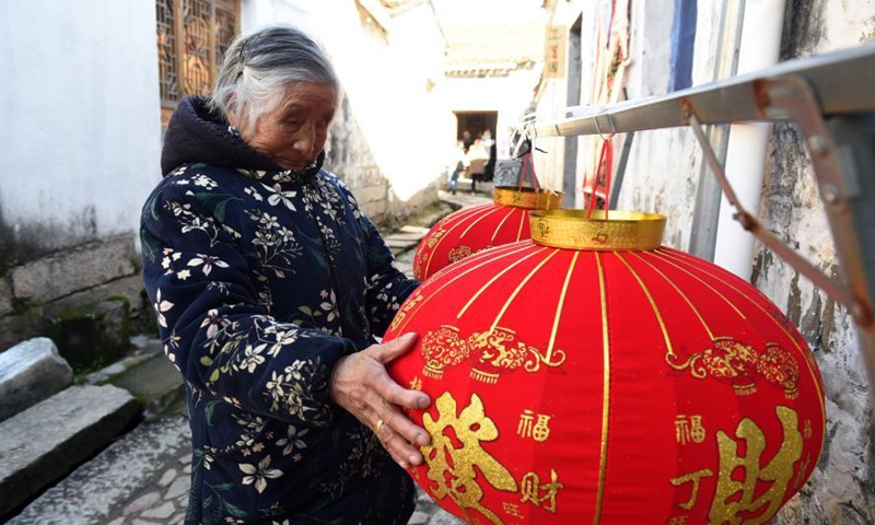 A villager hangs lanterns in Zhaji Village of Jingxian County, east China's Anhui Province, Feb. 6, 2021. As the Spring Festival approaches, villagers are busy preparing goods in Zhaji Village, a village with over 1,000 years of history. (Xinhua/Zhou Mu)