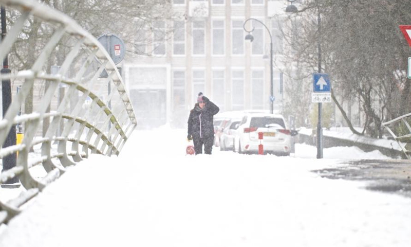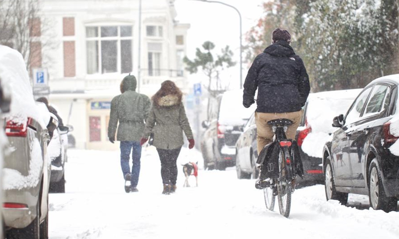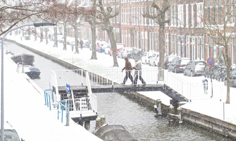 Pedestrians walk in the snowstorm in Haarlem, the Netherlands, Feb. 7, 2021. (Photo by Sylvia Lederer/Xinhua)