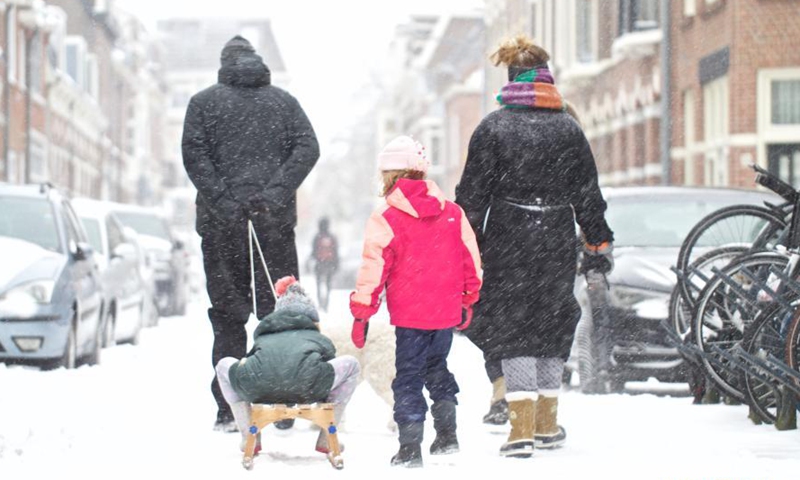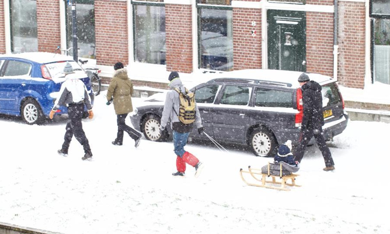 People enjoy the snow in Haarlem, the Netherlands, Feb. 7, 2021. (Photo by Sylvia Lederer/Xinhua)