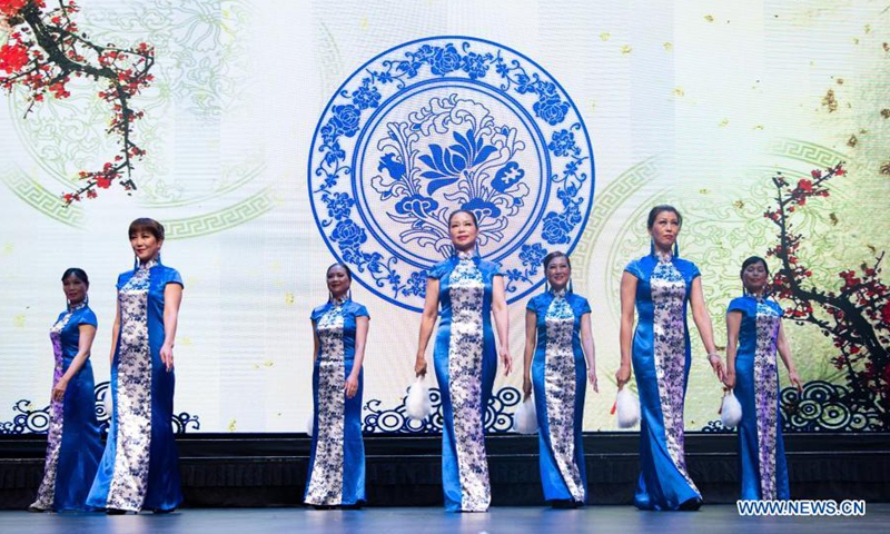 A traditional Chinese Qipao show is staged during the Festival of Spring Huaxing Gala Night held at SkyCity Theatre in Auckland, New Zealand, Feb. 7, 2021. (Photo by Sun Xueliang/Xinhua)