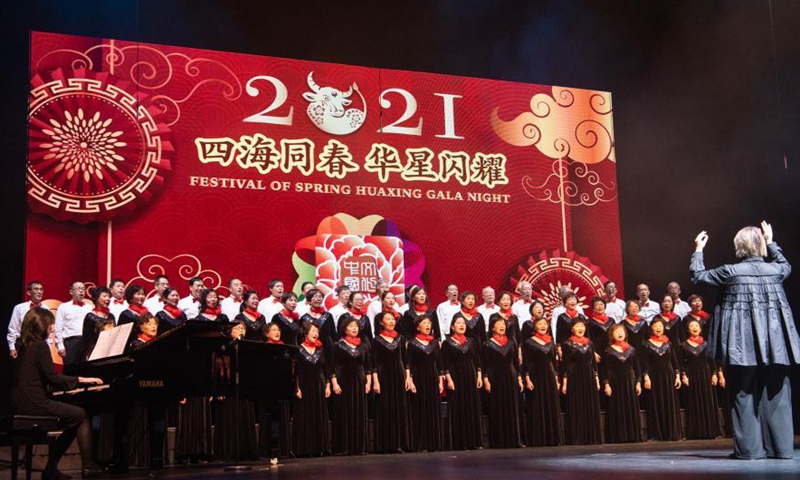 A chorus performs during the Festival of Spring Huaxing Gala Night held at SkyCity Theatre in Auckland, New Zealand, Feb. 7, 2021. (Photo by Sun Xueliang/Xinhua)