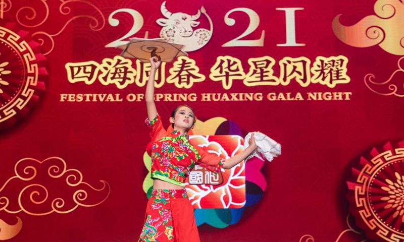 An artist performs during the Festival of Spring Huaxing Gala Night held at SkyCity Theatre in Auckland, New Zealand, Feb. 7, 2021. (Photo by Sun Xueliang/Xinhua)