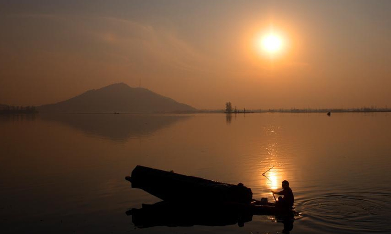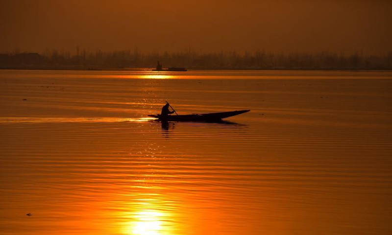 A man rows a boat at Dal Lake during sunset in Srinagar, the summer capital of Indian-controlled Kashmir, Feb. 7, 2021. (Xinhua/Javed Dar)