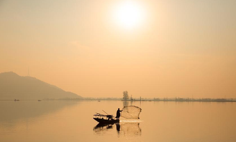 A fisherman throws net to catch fish at Dal Lake during a sunset in Srinagar, the summer capital of Indian-controlled Kashmir, Feb. 7, 2021. (Xinhua/Javed Dar)