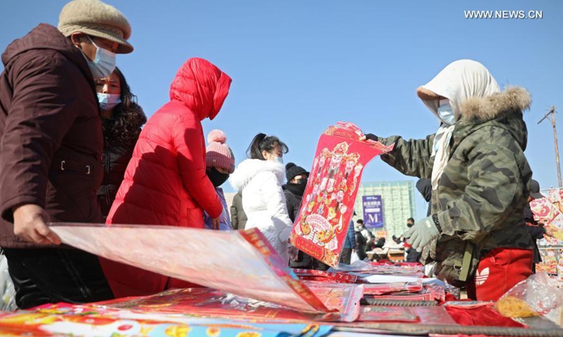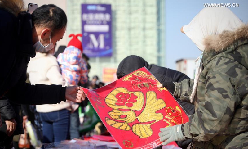 Citizens purchase Spring Festival-themed paintings at a traditional Spring Festival fair held in Bayuquan District of Yingkou, northeast China's Liaoning Province, Feb. 8, 2021. (Xinhua/Yao Jianfeng)