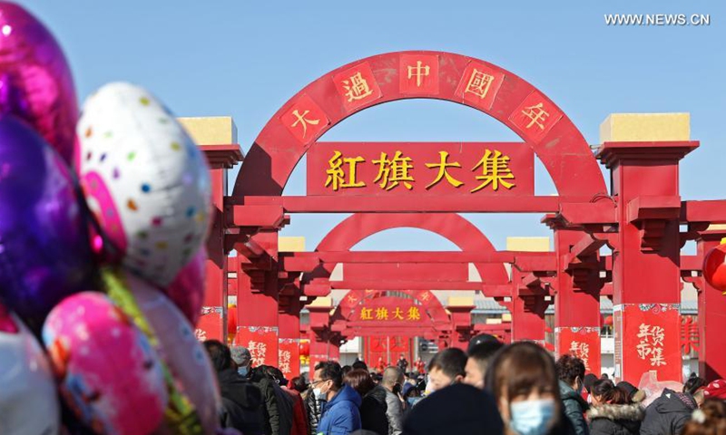 Citizens visit a traditional Spring Festival fair held in Bayuquan District of Yingkou, northeast China's Liaoning Province, Feb. 8, 2021. (Xinhua/Yao Jianfeng)