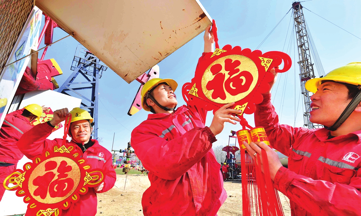 Oil workers in Puyang, Central China's Henan Province decorate housing at their camp on Monday for the upcoming Chinese New Year, which falls on Friday. Local governments in many areas of China are encouraging people to stay put for the Spring Festival for anti-epidemic purposes. Photo: cnsphoto