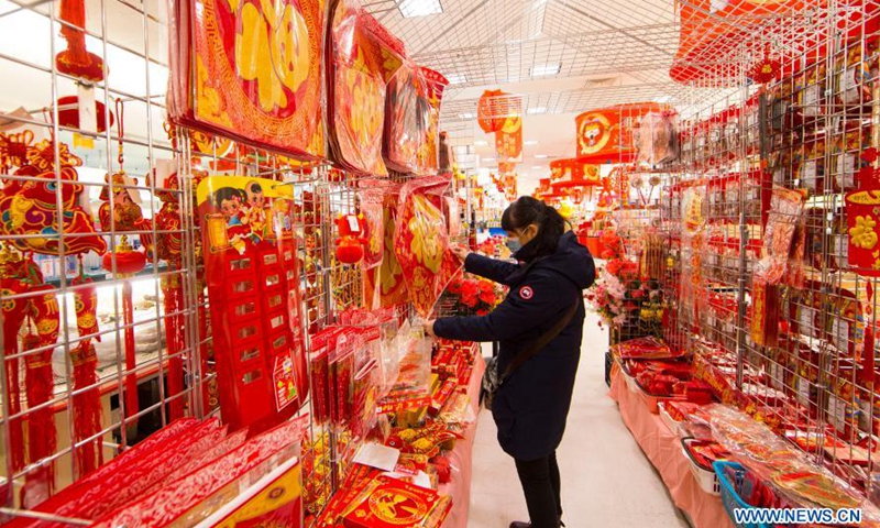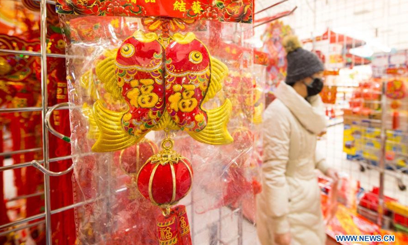 A customer wearing a face mask selects decorations for the upcoming Chinese Lunar New Year at a Chinese supermarket in Toronto, Canada, on Feb. 8, 2021. The Chinese Lunar New Year falls on Feb. 12 this year.Photo:Xinhua