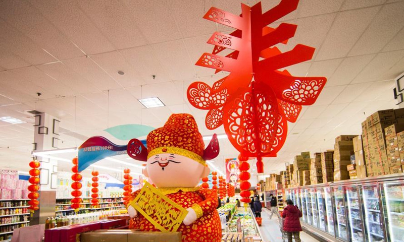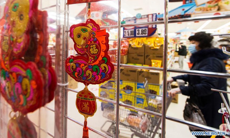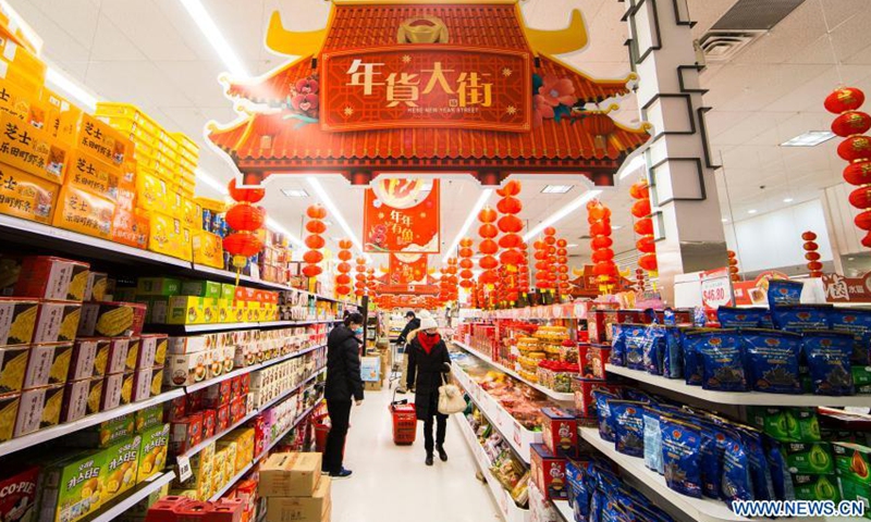 People wearing face masks shop at a Chinese supermarket with decorations marking the upcoming Chinese Lunar New Year in Toronto, Canada, on Feb. 8, 2021. The Chinese Lunar New Year falls on Feb. 12 this year.Photo:Xinhua