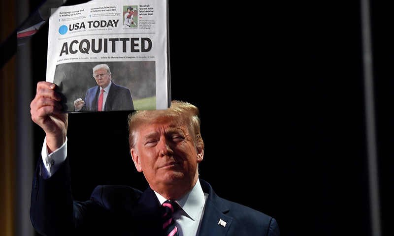 US President Donald Trump holds up a newspaper with the headline "Acquitted" as he arrives to speak at the 68th annual National Prayer Breakfast on Thursday in Washington, DC. Trump said Thursday that he suffered a "terrible ordeal" during his impeachment. Photo: AFP