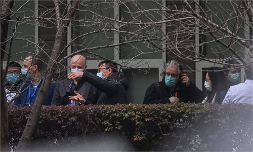 Peter Daszak (right) and other members of the World Health Organization (WHO) team investigating the origins of the COVID-19 arrive at the Wuhan Institute of Virology in Wuhan, Hubei Province on Wednesday. Photo: AFP