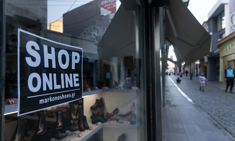 A closed store is seen in Halkida, a seaside town nearly 80 kilometers northeast of Athens, Greece, on Feb. 6, 2021. (Photo: Xinhua)